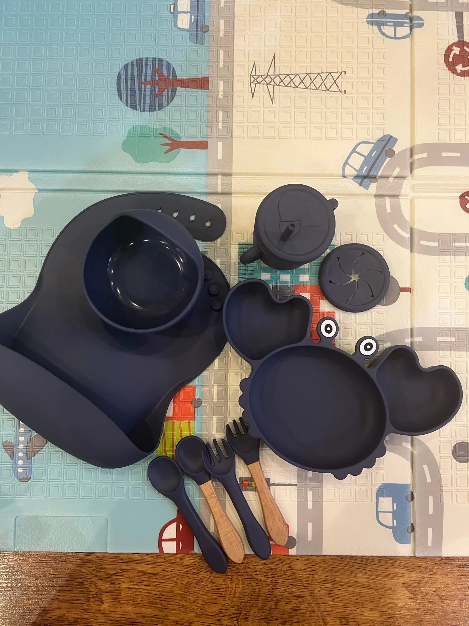This charming eight-piece baby feeding set, available in several vibrant colours, is crafted from certified food-grade silicone, ensuring safety, comfort, and easy cleaning. The set includes a bib, bowl, fun crab-shaped plate, cup with straw, and two forks and spoons, making it perfect for your little one's dining needs.